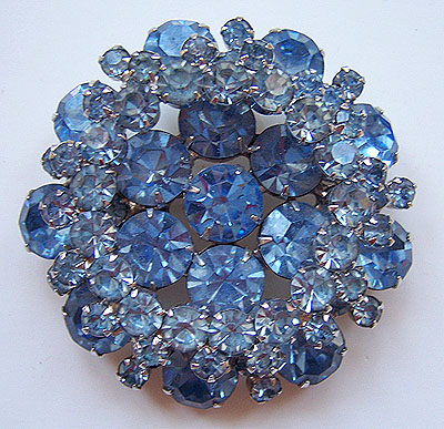 Tiered brooch really sparkles! Imitation aquamarine and blue topaz mirror-backed glass chatons and rhinestones are each prong-set. Quality silvertone setting -- this piece has a good weight to it. 2 3/8" diameter; excellent condition with all stones present and in good color, plating intact.