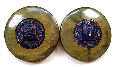 Decorative enameled cape clasps with celluloid "faux mosaic" design in the center. Eyelets on back for sewing onto garment, hooks on each inner edge so they attach together. Each measures 2 1/2" diameter. Some light crazing at one spot on the front of the marbled green. - $20