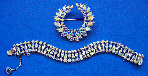 Signed B. DAVID aurora borealis rhinestone bracelet and matching wreath-style brooch, rhodium-plating. The aurora borealis coating picks up a lot of pink and yellow overtones. 7" length with slide-in clasp and safety chain. 1/2" width. 1 7/8" diameter brooch. Like-new condition, very sparkly and comfortable to wear.
