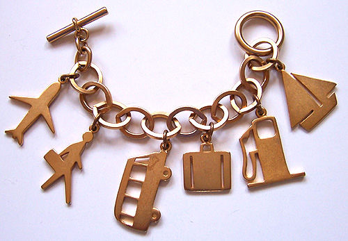 Fantastic signed ERWIN PEARL charm bracelet is bold and chunky, with modernist style travel theme charms including an airplane, bus, suitcase, gas pump, sailboat and tourist carrying luggage. Large interlocking links and toggle clasp; metal is gold-tone. Length is about 7 1/4". Each charm measures up to 1 1/4" in height and is marked E. Pearl. Very good vintage condition apart from mild surface scratching. - $60