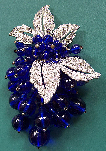 Unsigned Miriam Haskell dress clip, designed by Frank Hess, features dangling strands of cobalt blue glass beads in varying sizes, accented with clear rhinestone-set pot metal leaves. Elements are sewn to a pierced plastic backing; etched silver tone clip is in good working order. 3" total height. Excellent condition with normal mild wear to metal on reverse. - $160