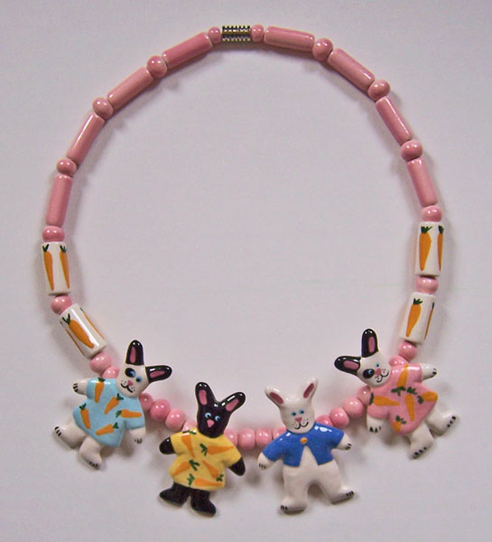 This ceramic bunny rabbit necklace by Flying Colors is perfect for Spring or Easter -- and we have some pins listed separately that would go well with these! Four ceramic rabbit pendants come in different colors and carrot-theme wardrobe; these measure approximately 2 1/2". Accentuated with pink tubular and round beads, and white with carrot motif tubular beads, all securely strung on nylon filament. Screw-barrel metal clasp. One bunny is marked Flying Colors on reverse. 22 1/2". Excellent condition. - $240