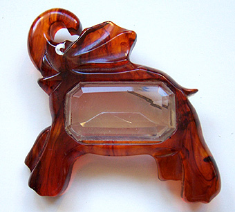 Discovered in a Munich antique shop, this bakelite and lucite belly elephant figural pin is unlike anything I've seen. Translucent tortoise bakelite body elephant with trunk up and painted eye, faceted rectangular lucite belly, two-piece embedded metal pin with locking mechanism. 2 1/2" across and 2 1/2" tall. Excellent condition overall (pin stem is slightly bent). - $350